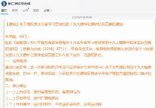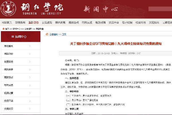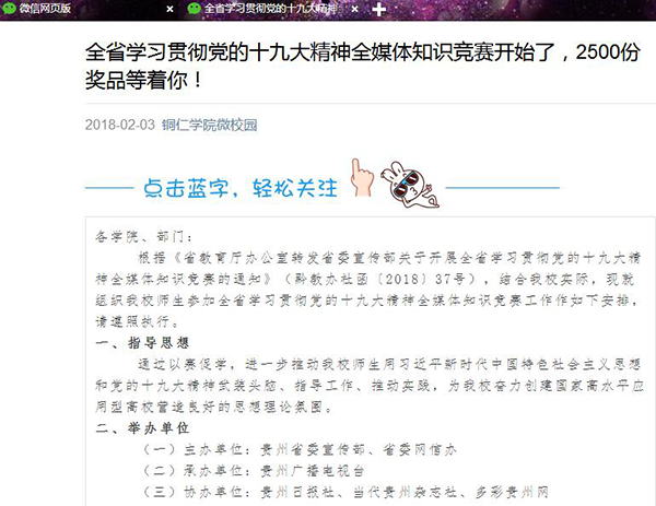 为巩固全省学习宣传贯彻党的十九大精神千团万场“大宣讲”成果,推动学习宣传党的十九大精神和习近平总书记在贵州省代表团的重要讲话精神向纵深发展,省委宣传部等六个部门联合开展了主题为“牢记嘱托 感恩奋进”党的十九大精神全媒体知识竞赛活动。伟德官网党委高度重视、认真落实此次知识竞赛,精心组织开展了为期六天的手机答题竞赛活动,全校师生积极参加。