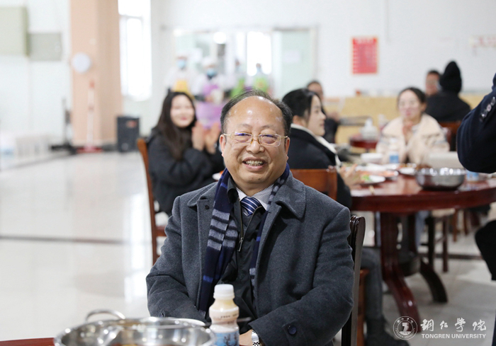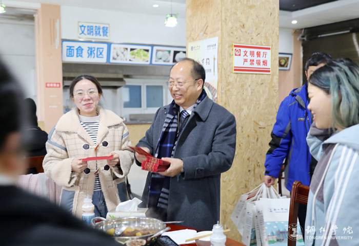 宴会现场,处处洋溢着浓浓的年味、弥漫着新春佳节的喜庆气氛。宴会开始前,石维代表学校向师生们致以新春的问候和诚挚的祝福,希望师生们在学校能度过一个温馨的、难忘的新年。宴会上,侯长林、石维亲切询问了师生们的工作学习生活情况,并向他们送上新年红包和春节礼物。师生们向学校领导和老师表达了新年的祝福,感谢学校对他们的关心,让身处他乡的他们感受到了家的温暖。侯长林还对坚守岗位、放弃与家人团聚、舍小家为大家的保卫、宿管、后勤员工等表示衷心的感谢。