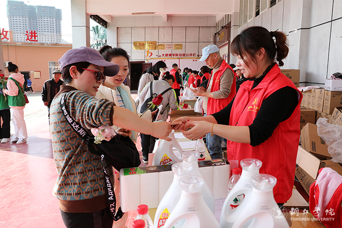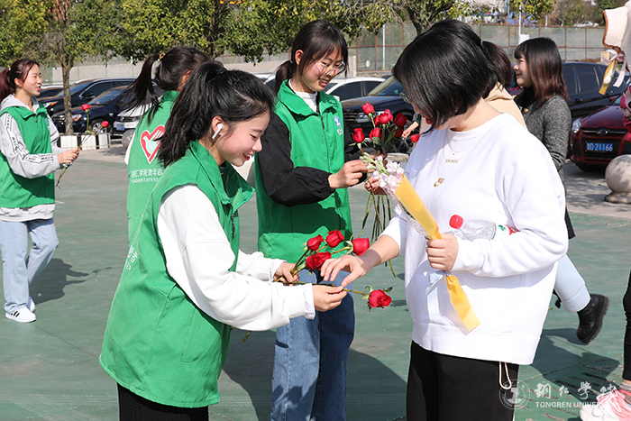 青年志愿者给老师们送花