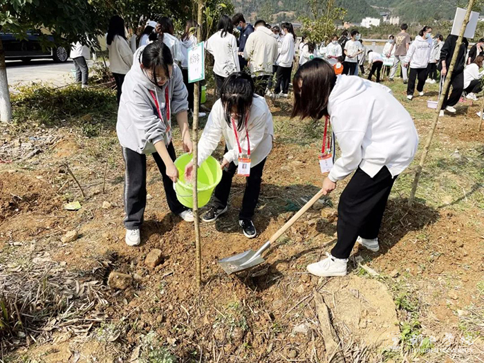 在植树现场,杨红为师生们现场讲解了植树的步骤、注意事项以及后期养护知识。随后,大家分工合作、密切配合,有序进行挖坑、施肥、栽树、培土、浇水等,经过两个多小时的辛勤劳作,共种下100棵楠木树苗。大家还在种植树苗的留言牌上写下祝福语并纷纷合影,大家表示,今后将不定期进行浇水、施肥和养护,确保今天种下的树苗茁壮成长,成为校园里的一道靓丽风景线。