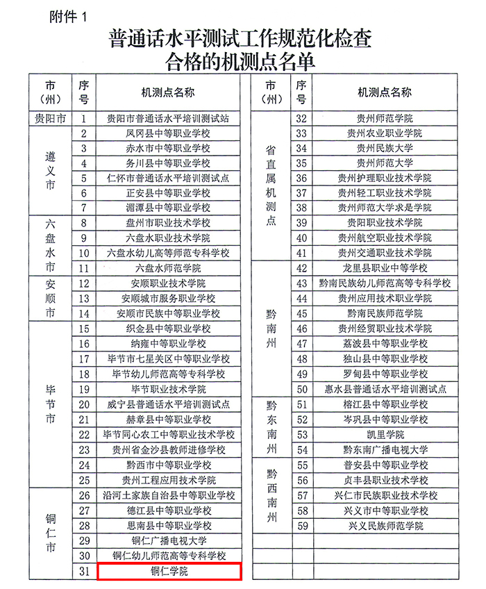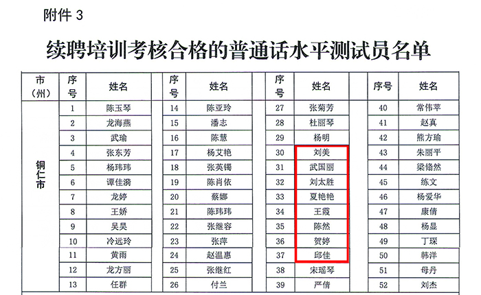 日前,贵州省教育厅办公室公布了全省普通话水平测试工作规范化检查及续聘考核结果,伟德官网机测点通过检查,刘美、武国丽、刘太胜、夏艳艳、王霞、陈然、贺婷、邱佳等8位测试员续聘培训考核合格。