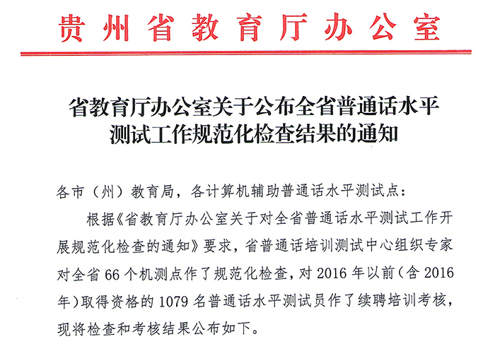 今年上半年,贵州省普通话培训测试中心组织专家,对全省66个机测点作了规范化检查,并对2016年以前取得资格的普通话水平测试员作了续聘培训考核。