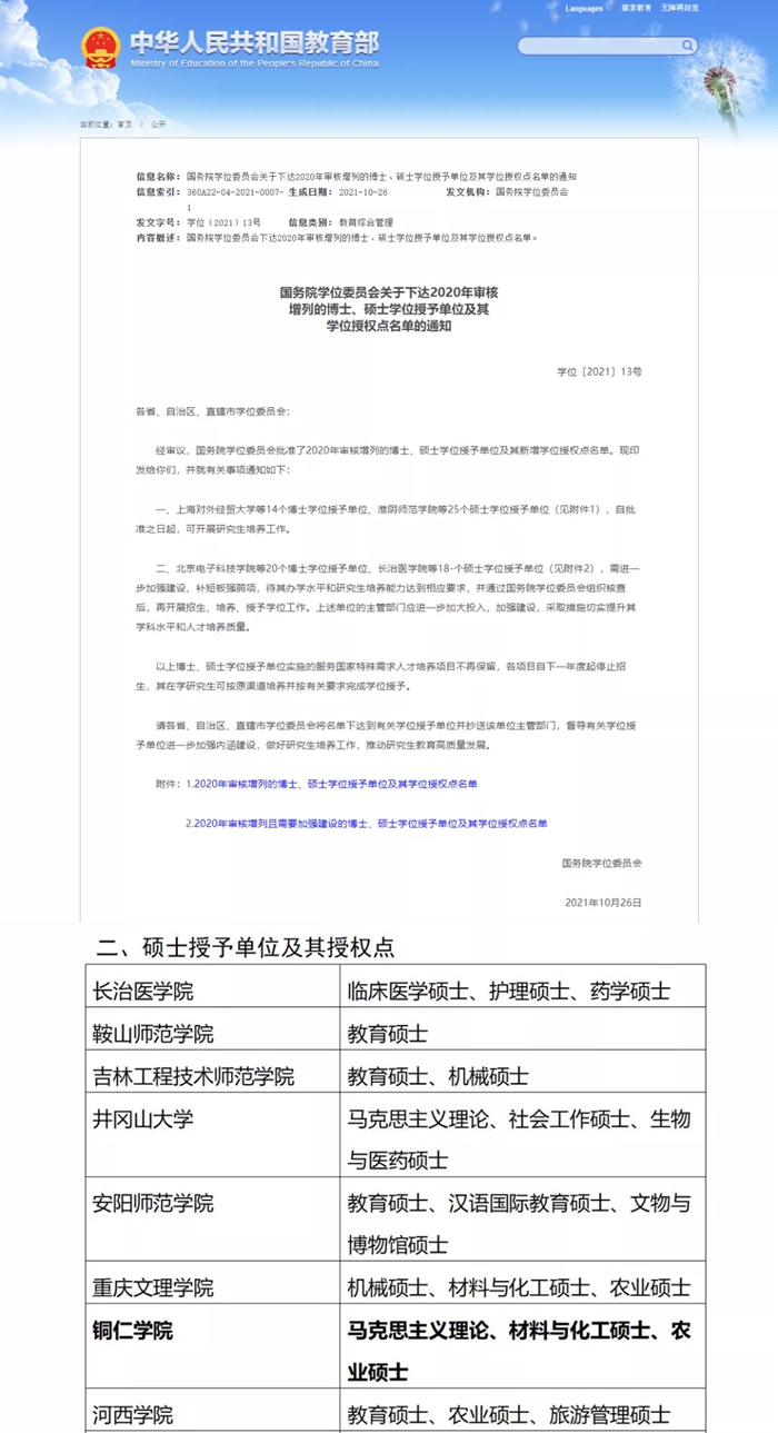10月26日,国务院学位委员会下达了2020年审核增列的博士、硕士学位授予单位及其新增学位授权点名单。伟德官网获批为2020年新增硕士学位授予单位,新增马克思主义理论一级学科硕士学位授权点,材料与化工、农业两个硕士专业学位授权点,结束了铜仁无研究生教育的历史。
