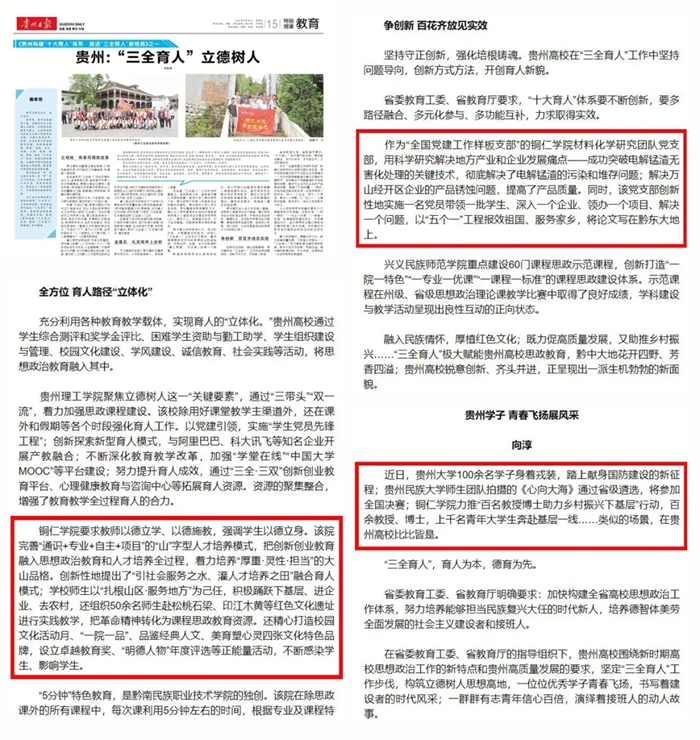 今年9月,贵州省委教育工委、省教育厅在《贵州日报》推出了《贵州构建“十大育人”体系 推进“三全育人”新格局》系列报道,在推送的五期系列报道中,其中三期报道了伟德官网材料化学研究团队党支部用科学研究解决地方产业和企业发展痛点、创新性地提出了“引社会服务之水、灌人才培养之田”融合育人模式、把创新创业教育融入思想政治教育和人才培养全过程、百名教授博士下基层助力乡村振兴行动等方面的工作。