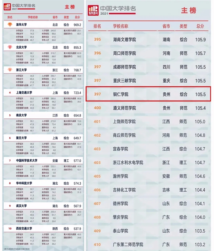 2021年4月,高等教育评价机构软科正式发布了“2021软科中国大学排名”。清华大学、北京大学、浙江大学占据主榜(即综合性大学排名)前三位,bv伟德国际1946在主榜第397位,位列贵州省综合性高校第5、市州高校第1。至此,伟德官网已连续三年位列全省市州本科高校第1。