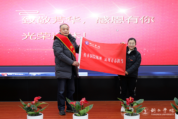 会上,播放了退休教职工工作业绩成果介绍视频;代亮、石维为退休教职工颁发了荣休证书;志愿者向退休教职工献花;退休职工代表向青年职工代表授予了“传承铜院精神 展现青春担当”红旗。