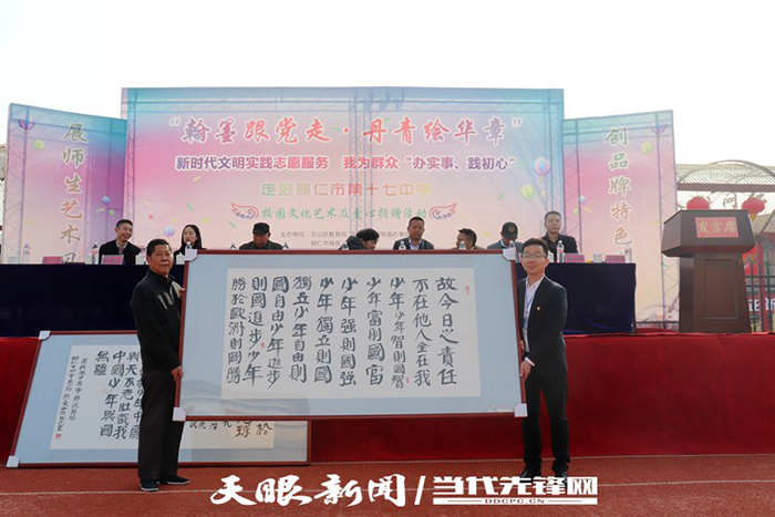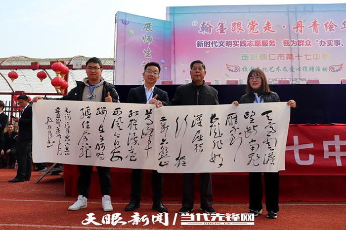 贵州日报、多彩贵州网、铜仁日报、铜仁电视台等多家对活动进行了采访。面对记者,老同志谭光涛对记者说:“关心下一代,是我们bv伟德国际1946关工委的神圣职责,希望我们的所作所为能够帮助十七中易地搬迁的学生们成长成才,这就是我们最大的收获和幸福!”老同志谢元炳说:“在建党百年的今天,我们响应号召为民办实事,我们希望捐献的书画作品能够成为孩子们的精神食粮,激励他们不断前行。”十七中副校长杨勇说:“感谢bv伟德国际1946关工委和各爱心单位的关心和帮助,我们一定要把学校建设成为学生向往、学长认可、社会满意的易地脱贫搬迁学校。”