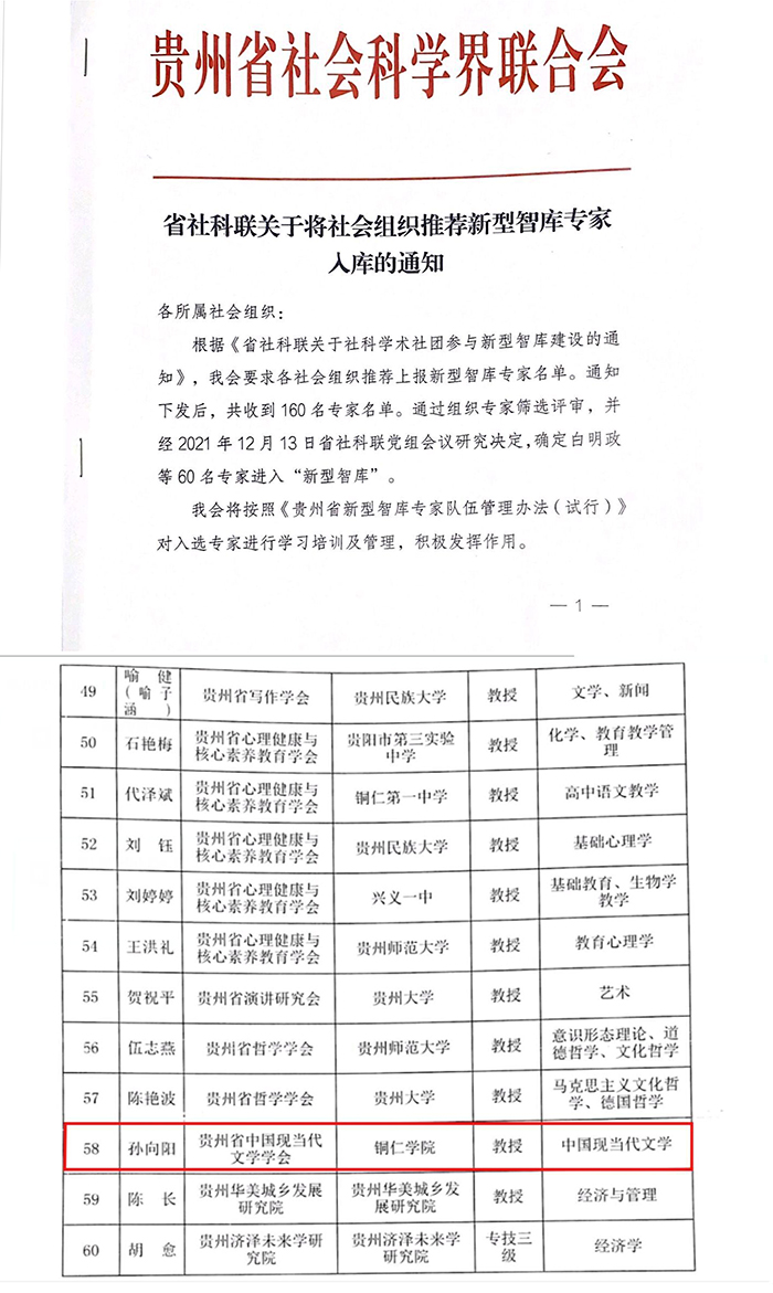 近日,贵州省社会科学界联合会印发社会组织推荐新型智库专家入库的通知,公布了贵州省新型智库专家名单。伟德官网人文学院党委书记、院长,写作研究院院长,贵州师范大学硕士生导师孙向阳教授入选中国现当代文学研究领域新型智库专家。据悉,本次入选新型智库专家共有60人,是在省社科联所属的社会组织上报的160人中,经省社科联组织专家严格筛选评审,并经省社科联党组会议研究确认的。