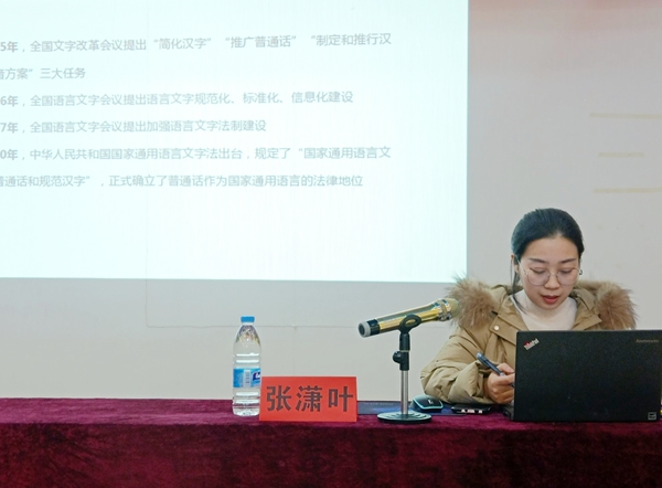 培训期间,人文学院党委书记、院长孙向阳为全体学员作了题为《学习贯彻会议精神,深刻把握使命担当》的主题讲座,为全体学员传达了习近平总书记视察贵州重要讲话精神、党的十九届六中全会精神、贵州省委十二届十次会议精神、中央民族工作会议精神;人文学院教师张潇叶向全体学员介绍了国家语言文字法律法规及标准,带领大家深入了解国家语言文字的法律法规的内容、目的、意义、影响,结合生活实际和生动案例概述普通话推广的意义;人文学院教师刘太胜为学员们系统讲解了普通话的基本知识与发音要领,结合铜仁各地方言辨正普通话重、难点音,在课上带领学员对易错、易混的语音进行辨正,并现场纠音,互动效果好;人文学院教师王彬向全体学员介绍了普通话测试中的注意事项,重点讲解了普通话测试的流程与要点。