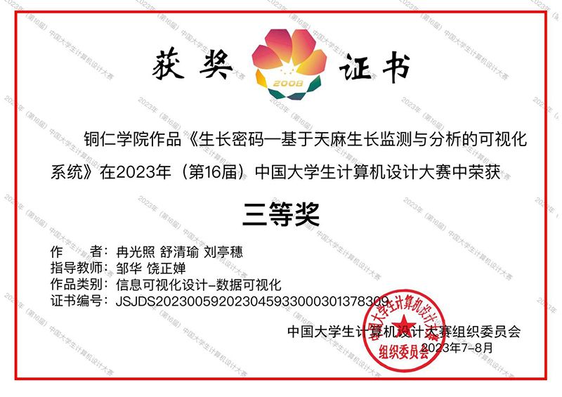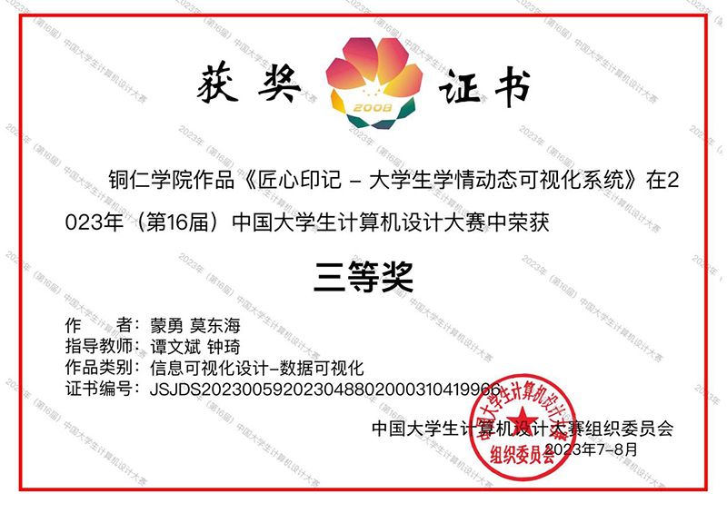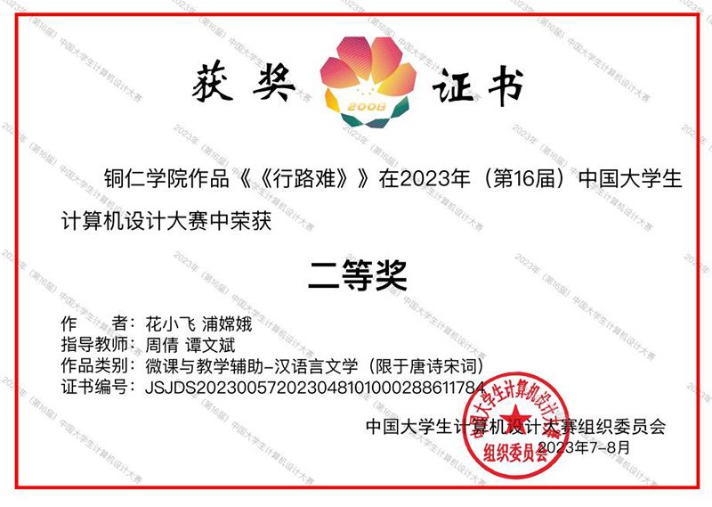 近日,第16届中国大学生计算机设计大赛落下帷幕。本届大赛共有全国500所高校3708名大学生参赛,收到参赛作品1108件,其中物联网作品564件、数媒动画短片作品544件。伟德官网大数据学院学生获得4项国家级奖项,其中二等奖1项、三等奖3项。