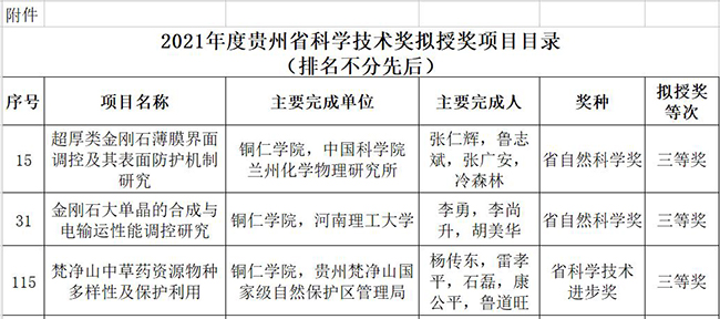 近日,贵州省科技厅对2021年度省科学技术奖评审结果进行公示,伟德官网共获得3个奖项。其中,伟德官网张仁辉教授等申报的《超厚类金刚石薄膜界面调控及其表面防护机制研究》和李勇教授等人申报的《金刚石大单晶的合成与电输运性能调控研究》获得贵州省自然科学奖三等奖,杨传东等申报的《梵净山中草药资源物种多样性及保护利用》获得贵州省科学技术进步奖三等奖。
