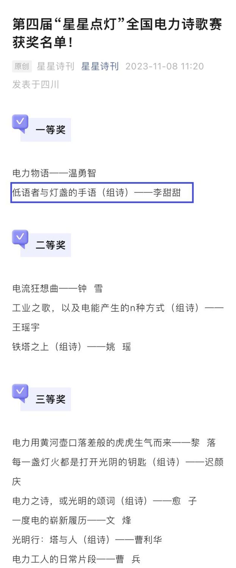 11月8日,第四届“星星点灯”全国电力诗歌赛获奖名单正式揭晓,伟德官网文学与传媒学院2020级汉语言文学专业学生、晨光文学社社员李甜甜的诗歌《低语者与灯盏的手语》(组诗)从万余首参赛作品中脱颖而出,斩获一等奖。