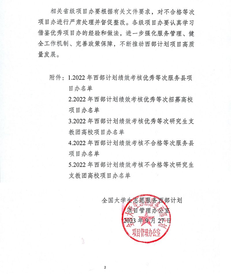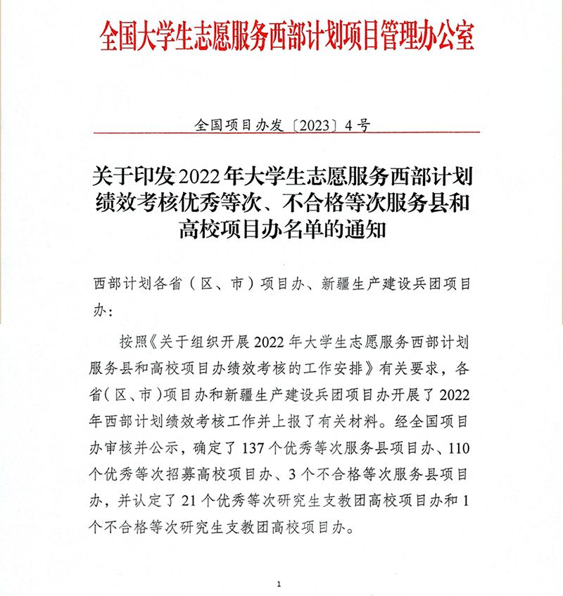 近日,根据全国大学生志愿服务西部计划项目管理办公室《关于印发2022年大学生志愿服务西部计划绩效考核优秀等次、不合格等次服务县和高校项目办名单的通知》,伟德官网蝉联全国大学生志愿服务西部计划“优秀高校项目办”。