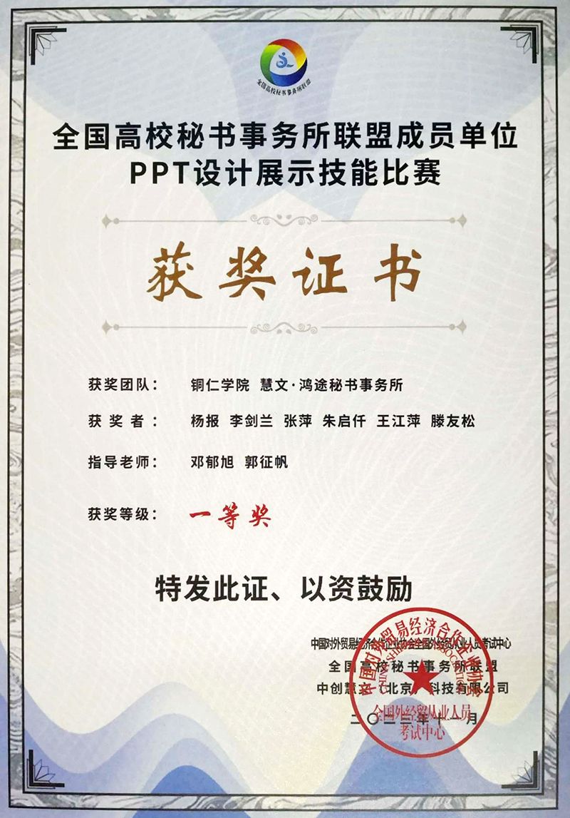 近日,第四届全国高校秘书事务所联盟大会暨秘书教育高质量发展论坛在云南民族大学举行。论坛开幕式上,举行了全国高校秘书事务所联盟成员单位PPT设计展示技能比赛获奖作品颁奖仪式。伟德官网慧文·鸿途秘书事务所的参赛作品荣获一等奖,这是全国高校秘书事务所联盟自2019年组织相关技能竞赛以来,伟德官网第五次获此殊荣。