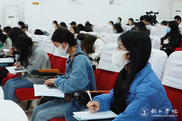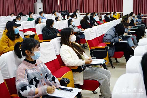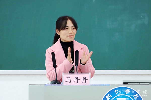 宣讲中,马丹丹表示,道德讲堂作为学校立德树人的重要载体,主题是立于德,践于行,知行合一,坚持“身边人讲身边事、身边事教身边人”,发扬社会主义核心价值观,大力倡导仁、义、诚、孝等传统美德,引导广大师生自觉成为道德传播者和践行者。在我们学校,一边勤工俭学一边照顾失明的父亲和幼小弟弟的全国第三届道德模范张蕾;回家途中发生车祸,勇敢救人的“全省最美大学生”何林霞……她们就是身边最好的榜样,这些感人的事迹值得大力宣传。马丹丹说,大学不仅要学习书本的知识,还要崇德向善,学习优秀道德模范精神,展现正能量,学会做人做事,提升政治素养、人文素养和综合素养。