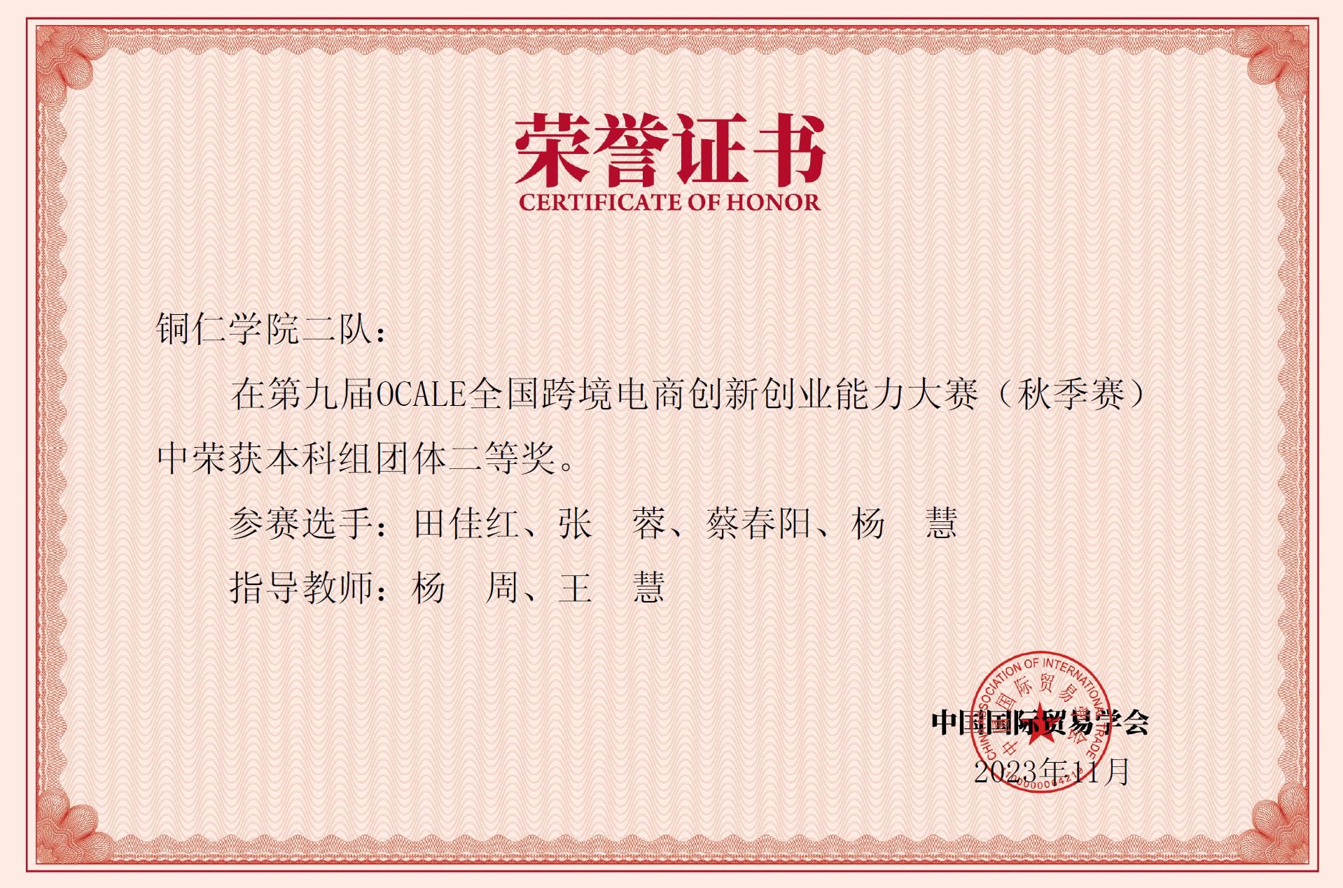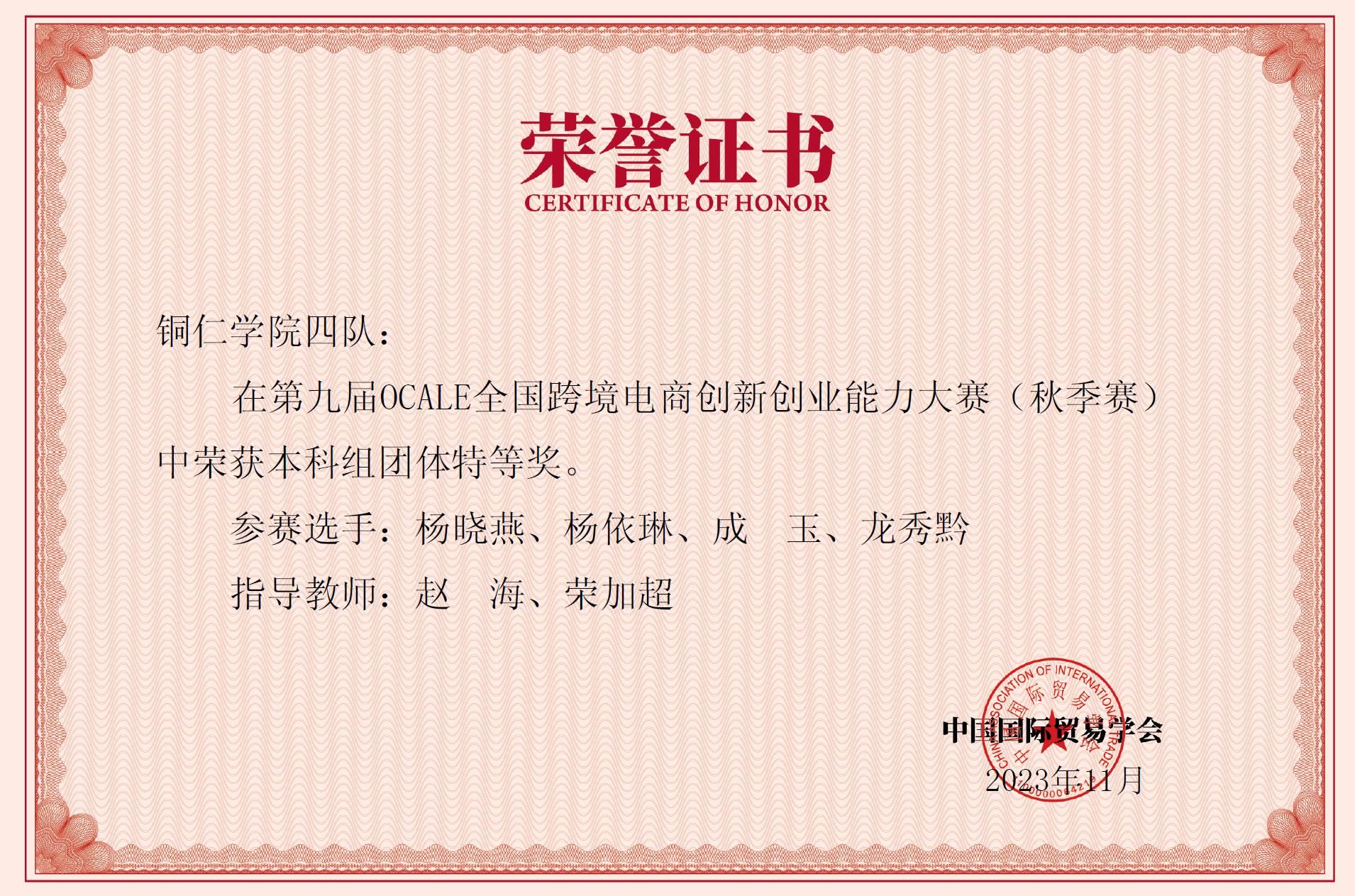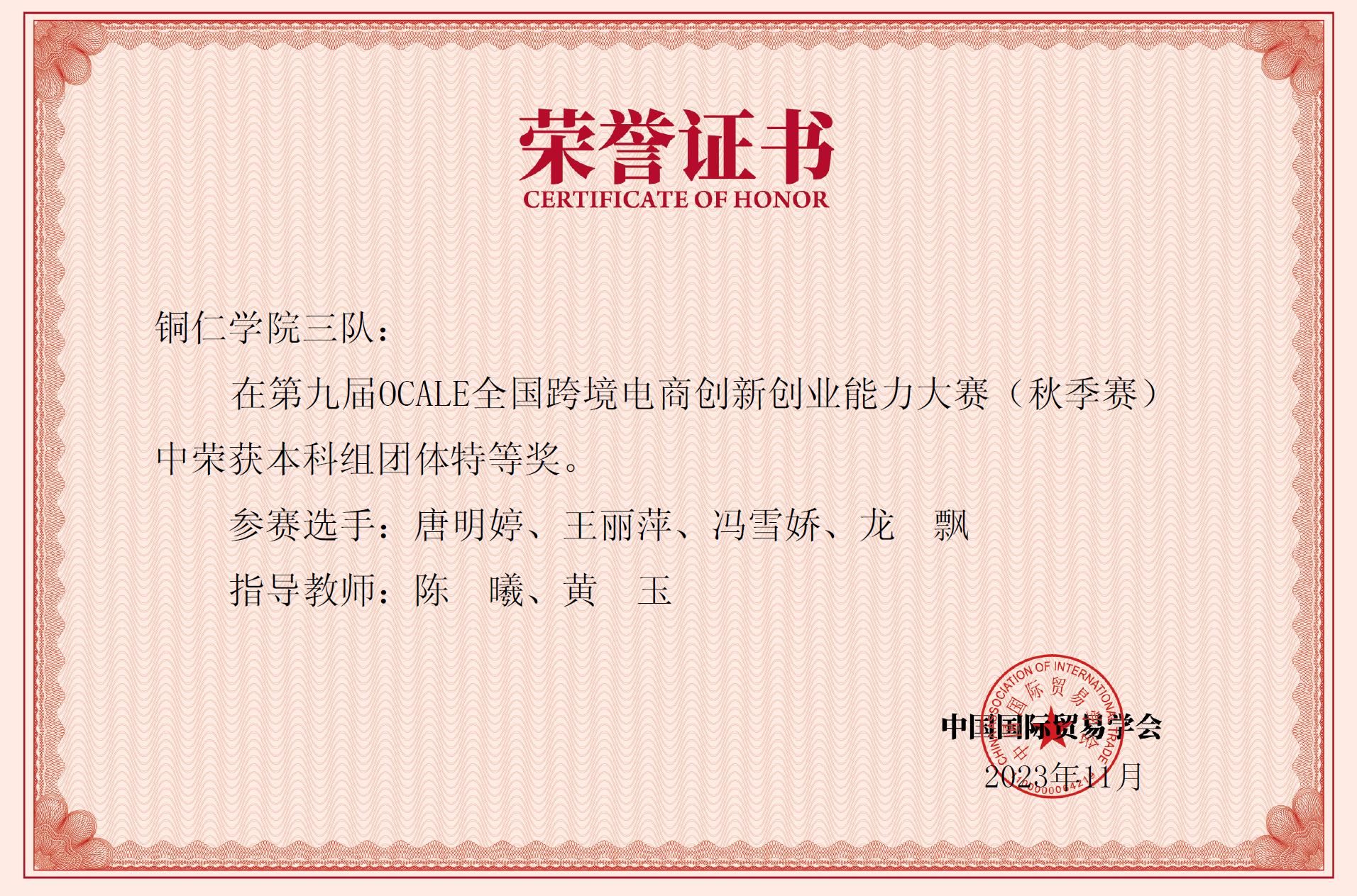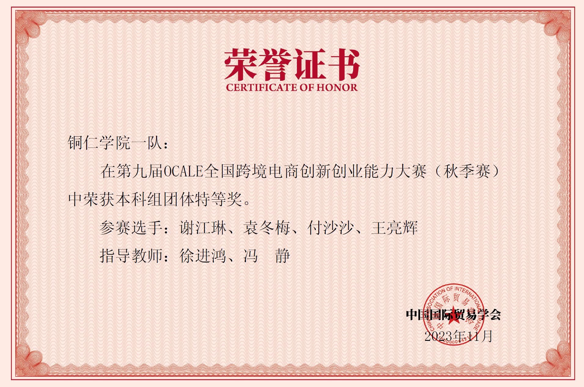近日,由中国国际贸易学会举办的第九届OCALE全国跨境电商创新创业能力大赛(秋季赛)圆满结束。伟德官网与铜仁职业技术学院联办的会计学专业2021级专升本3班派出5支队伍参赛,在本科组中取得团队特等奖四项和团队二等奖一项的好成绩。