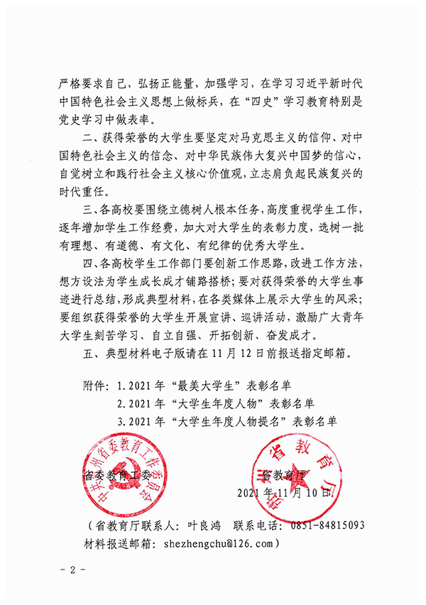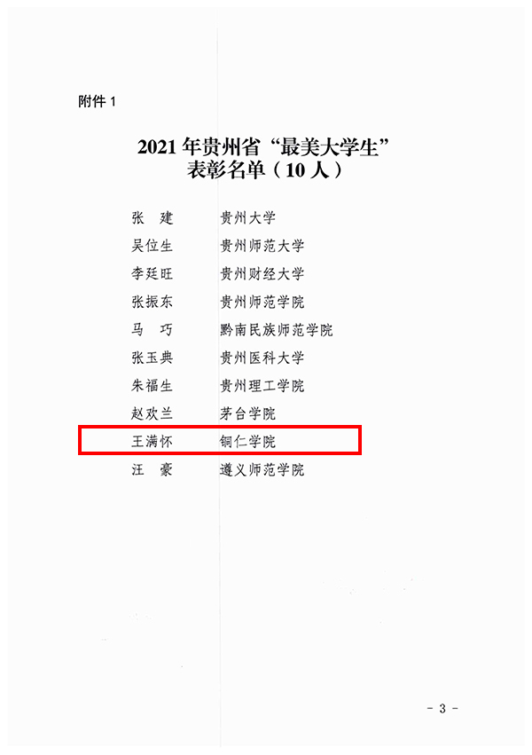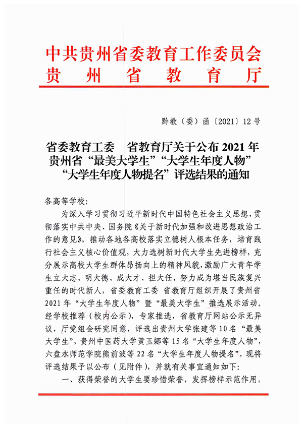 日前,中共贵州省委教育工委、贵州省教育厅下发了《关于公布2021年贵州省“最美大学生”“大学生年度人物”“大学生年度人物提名”评选结果的通知》,伟德官网大数据学院2018级计算机科学与技术专业学生王满怀喜获2021年贵州省“最美大学生”荣誉称号。