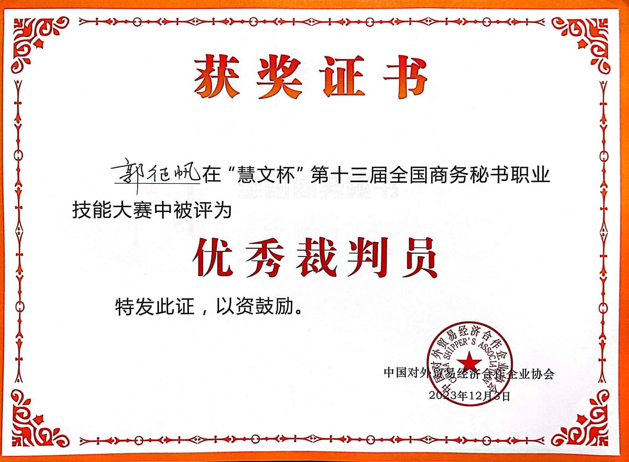 大赛期间,伟德官网秘书学专业负责人郭征帆还被聘请为大赛裁判员,参与了秘书工作情境展示和职业演讲赛项的评判工作,并被评为优秀裁判员。
