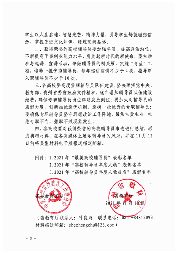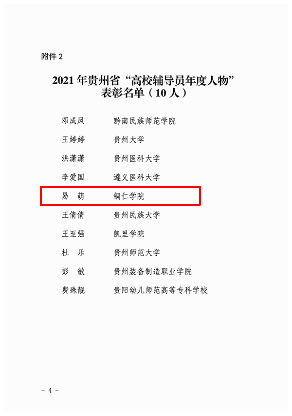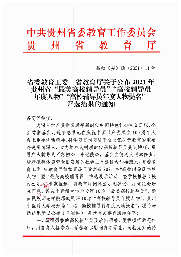近日,中共贵州省委教育工委、贵州省教育厅下发了《关于公布2021年贵州省“最美高校辅导员”“高校辅导员年度人物”“高校辅导员年度人物提名”评选结果的通知》,伟德官网大数据学院辅导员易萌喜获2021年贵州省“高校辅导员年度人物”荣誉称号。