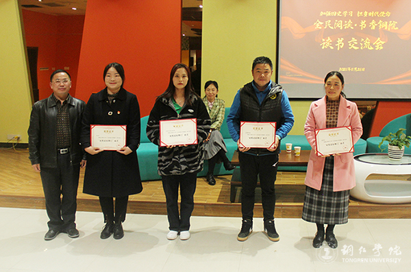 交流会上,举行了2021年“全民阅读·书香铜院”优秀部门和阅读先锋获得者颁奖仪式,表彰在一年的阅读推广活动中所涌现出来的“优秀读书部门”和“阅读先锋”。最后,读书交流会在艺术学院黄杨欢同学演唱歌曲《奋斗的时代在一起》的优美歌声中结束。