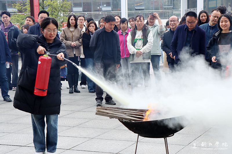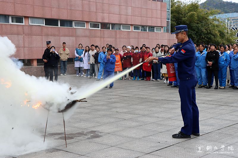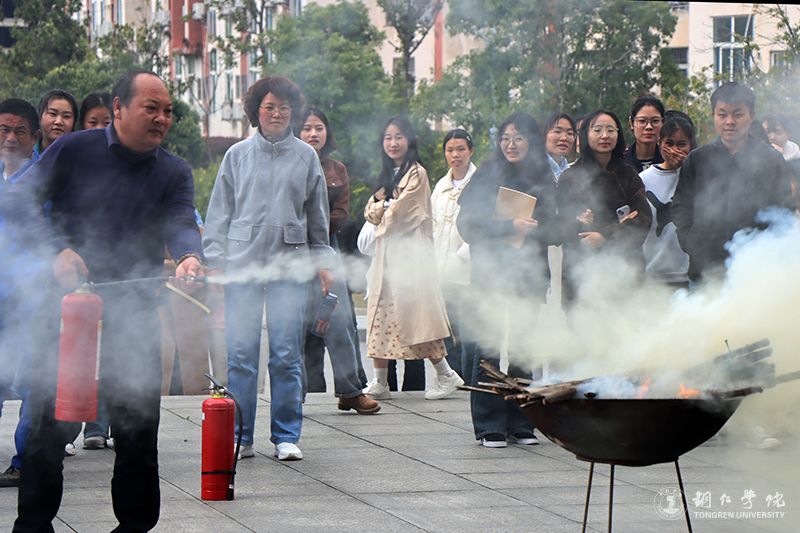 随后,进行消防安全应急演练。随着警报响起,同学们有序沿着消防道路,弯着腰,用手、袖口等捂着嘴鼻,迅速有序地疏散到校园的安全地带集合。大家集合完毕,消防人员向大家讲解、示范了灭火器的使用方法及注意事项,并指导伟德官网师生进行现场灭火演练。现场的师生纷纷体验了灭火器的操作与使用。