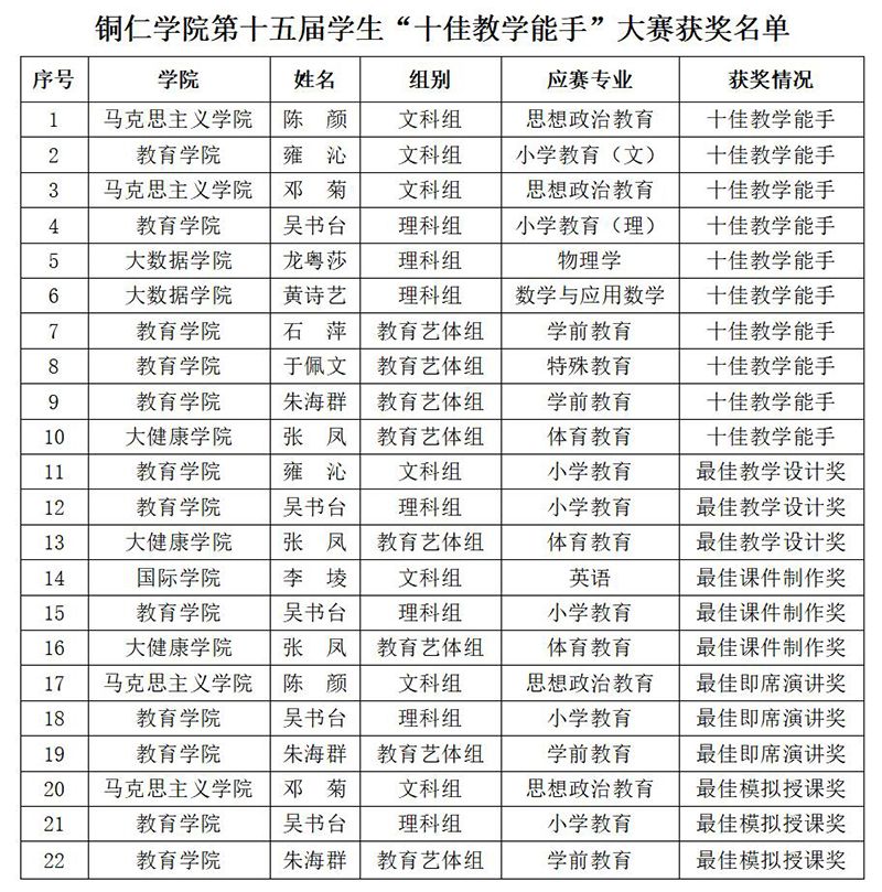 经过比赛现场的紧张角逐,根据评委现场对选手表现的评审,结合教学设计、课件制作的总和得分,本次大赛获奖名单如下:
