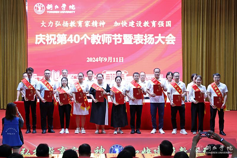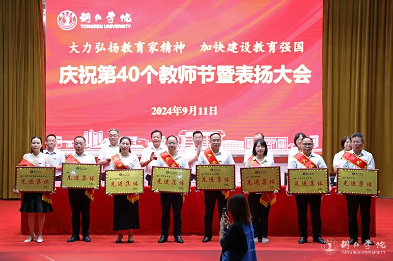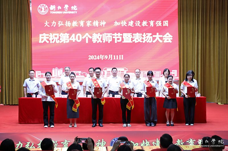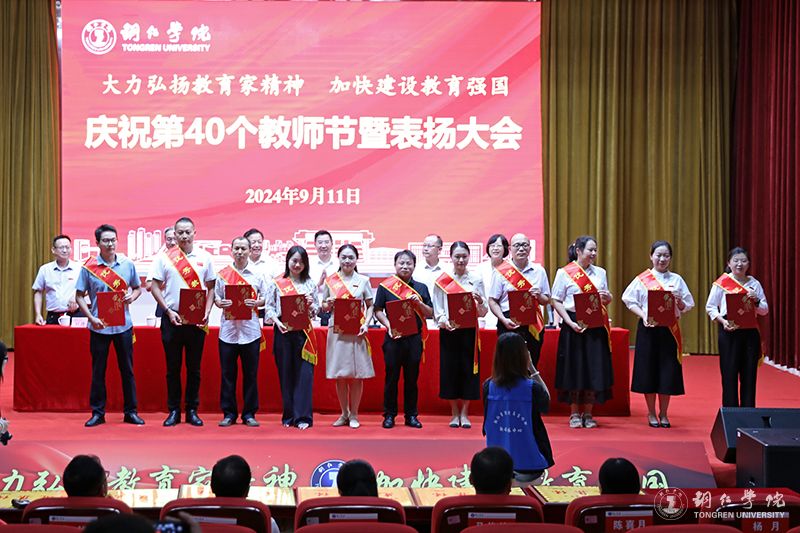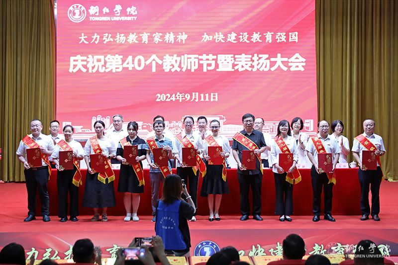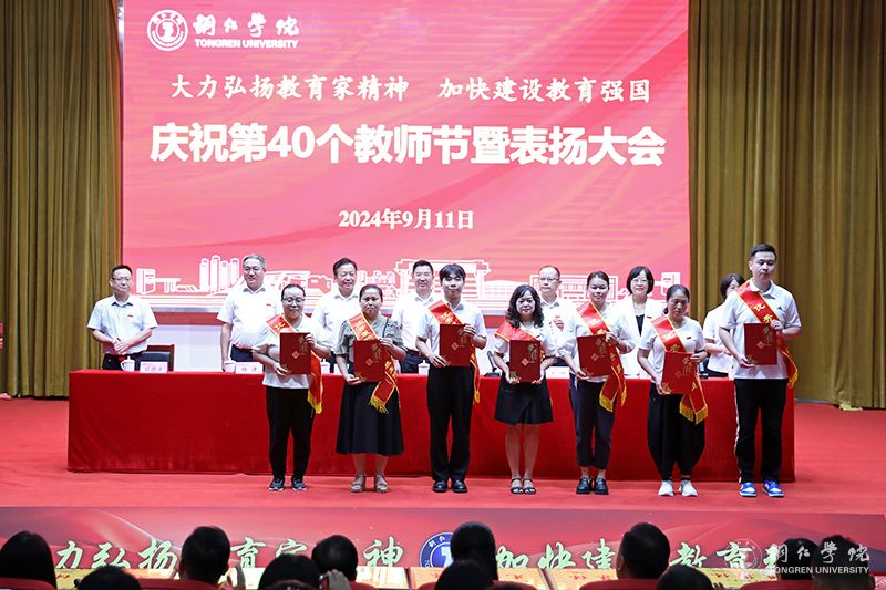 会议宣读了受表扬的先进集体和优秀个人名单,出席会议领导为获奖集体和个人代表进行了颁奖。此次会议,共表扬了优秀教师70人,优秀教育工作者28人,先进集体8个,师德标兵、师德先进个人7人,优秀辅导员及优秀兼职辅导员(班主任)10人,以及2023年贵州省普通本科高校“金师”(教学名师)2人、伟德官网第九届卓越教育奖获得者18人。