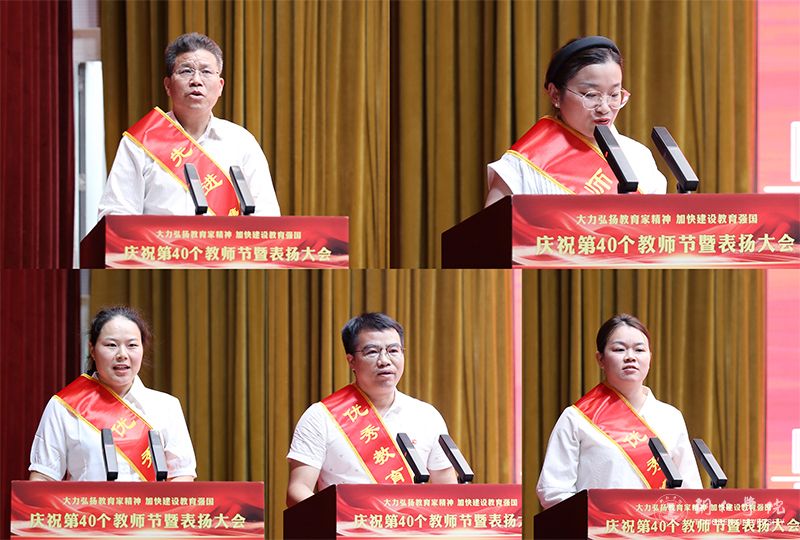 会上,先进集体代表、教育学院院长梁成艾,优秀教师代表、哲学与历史文化学院蒋欢宜,优秀教育工作者代表、党委宣传部张东方,师德模范代表、教育学院陆艳,优秀辅导员代表、材料与化学工程学院向媛分别作了发言,分享了他们在教育工作岗位上的点滴故事,畅谈了他们对教师的责任、使命、担当、情怀的理解和坚守,表达了他们积极投身教育事业、努力培养时代新人的信心与决心。