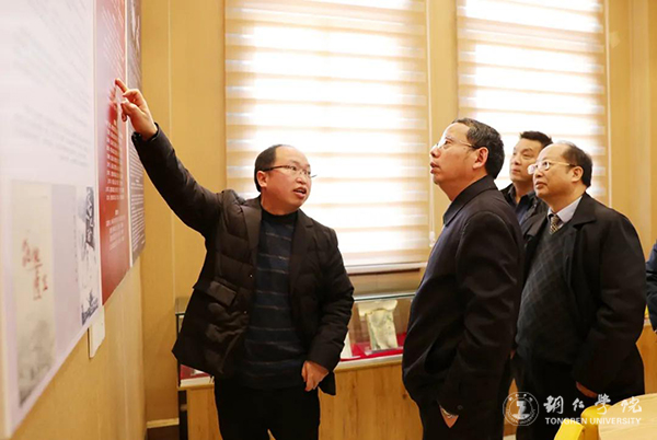 孙向阳教授向欧阳黔森(中)介绍铜仁文学馆“欧阳黔森作品陈列室”建设情况