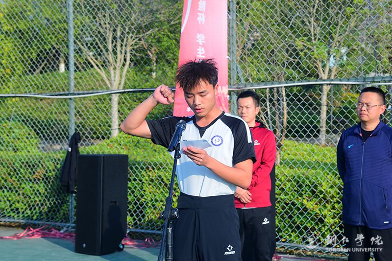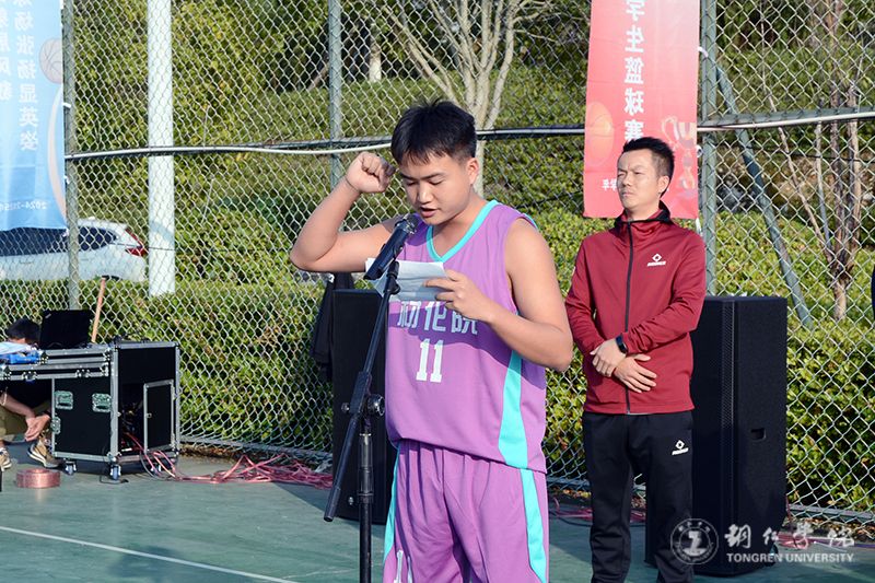 仪式上,大健康学院张正家代表裁判员进行宣誓;材料与化学工程学院万中华代表运动员进行宣誓;龚静宣布2024—2025学年“人保财险杯”学生篮球赛正式开始;杨敏为比赛开球。