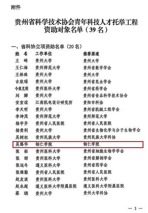 12月5日,贵州省科学技术协会召开2024年贵州省科学技术协会青年科技人才托举工程入选培训会议。会议公布了2024年(首批)贵州省科学技术协会青年科技人才托举工程资助对象共39名,其中省科协立项资助20名,每人每年资助5万元,连续资助2年,提名自筹资助19名。