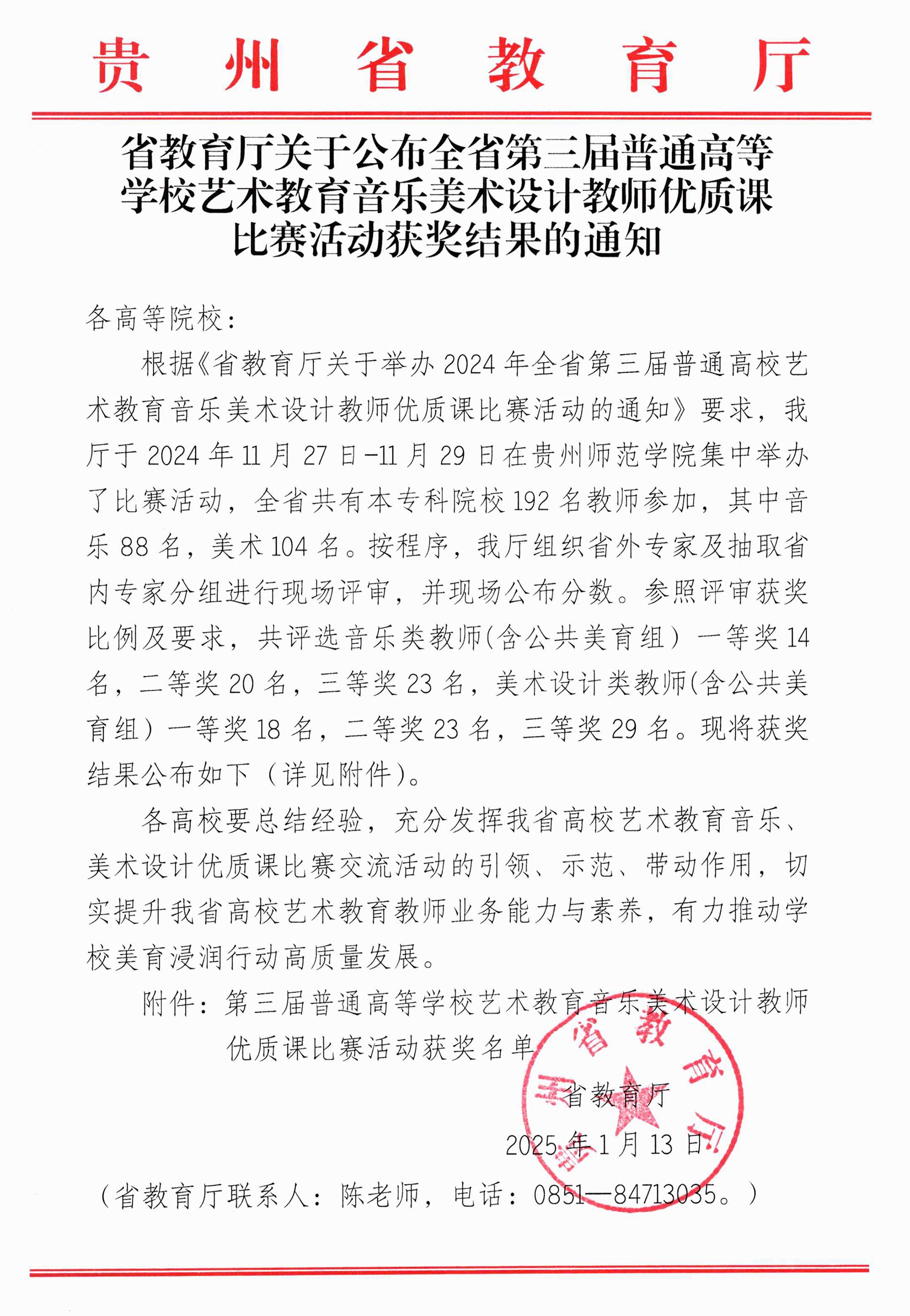 根据《省教育厅关于举办2024年全省第三届普通高校艺术教育音乐美术设计教师优质课比赛活动的通知》要求,全省共有本专科院校192名教师参加,其中音乐88名、美术104名,伟德官网艺术学院积极组织教师参加了此次比赛活动。省教育厅组织省外专家及抽取省内专家分组进行了现场评审,并参照评审获奖比例及要求,最终,评选出音乐类教师一等奖14 名、二等奖20名、三等奖23名,美术设计类教师一等奖18名、二等奖23名、三等奖29名。伟德官网王振国老师荣获公共美育组(音乐)一等奖,田隽老师荣获本科组(美术设计)二等奖,罗亚琴老师荣获本科理论组(音乐)三等奖,张惠芬老师荣获本科实践组(音乐)三等奖,张剑老师荣获本科组(美术设计)三等奖。