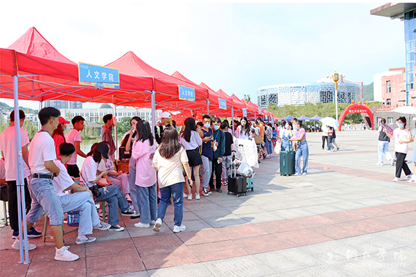 迎新活动主要集中在南大门和明德湖广场,放眼望去,帐篷林立。校园内各主道上,随处可见志愿者匆匆忙忙的身影,他们或拉着行李,或扛着麻袋,穿梭在南大门和明德湖广场、广场和学生宿舍之间。一路上,志愿者们和新生们“互诉衷肠”,志愿者分享他们的学习和生活心得,新生则吐露面对新环境的真实情感,此时此景连同欢声笑语一起汇成了一道靓丽的校园风景线。