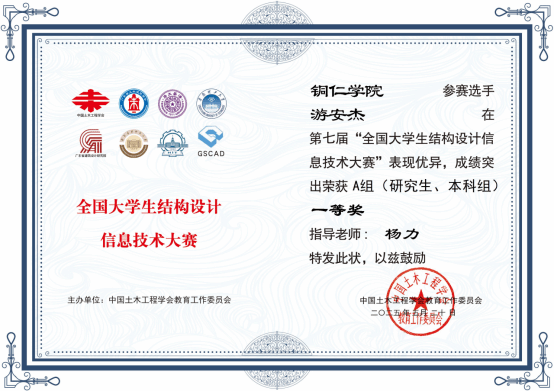 5月20,第七届“全国大学生结构设计信息技术大赛”获奖公布。伟德官网农林工程与规划学院土木工程专业2021级学生游安杰(指导老师:杨力)在A组(研究生、本科生)比赛中荣获一等奖。