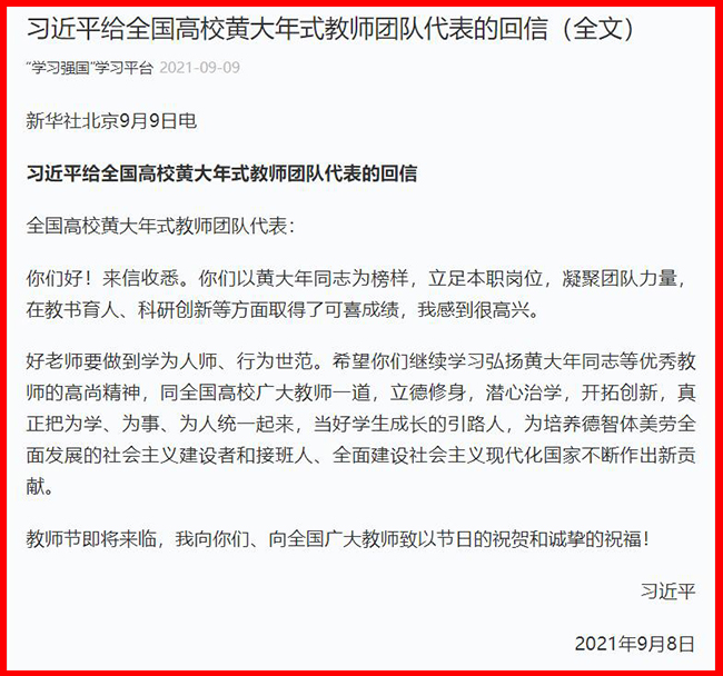 在第37个教师节即将到来之际,中共中央总书记、国家主席、中央军委主席习近平9月8日给全国高校黄大年式教师团队代表回信,勉励他们真正把为学、为事、为人统一起来,当好学生成长的引路人,并向全国广大教师致以节日的祝贺和诚挚的祝福。