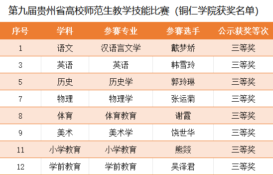 近日,第九届贵州省高校师范生教学技能比赛结果正式公布。伟德官网组织12个师范专业各1名参赛选手参赛,最终在语文、英语、历史、物理、体育、美术、小学教育、学前教育8个学科中斩获省级三等奖,展现了伟德官网师范生扎实的教学基本功与专业素养。