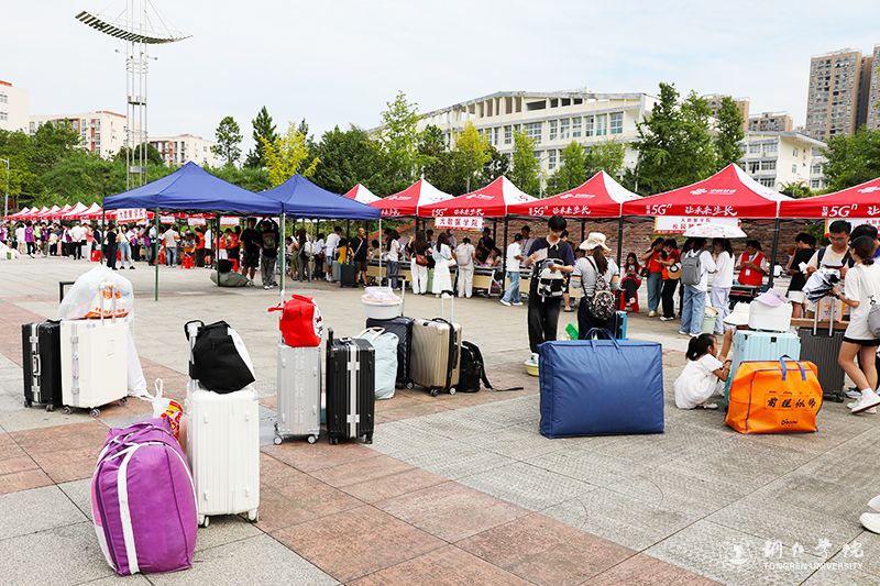 今年迎新工作主要在南大门和明德湖广场开展,现场布置井然有序。“热烈欢迎2025级新同学”等标语鲜艳醒目,迎新帐篷分列整齐。各二级学院以及学生志愿者团队早早到位,热情等候每一位新生。2025级新生们带着对未来的期待与梦想走进校园,成为秋日铜院最动人的风景。