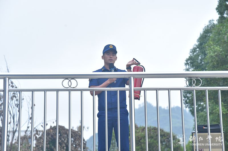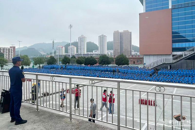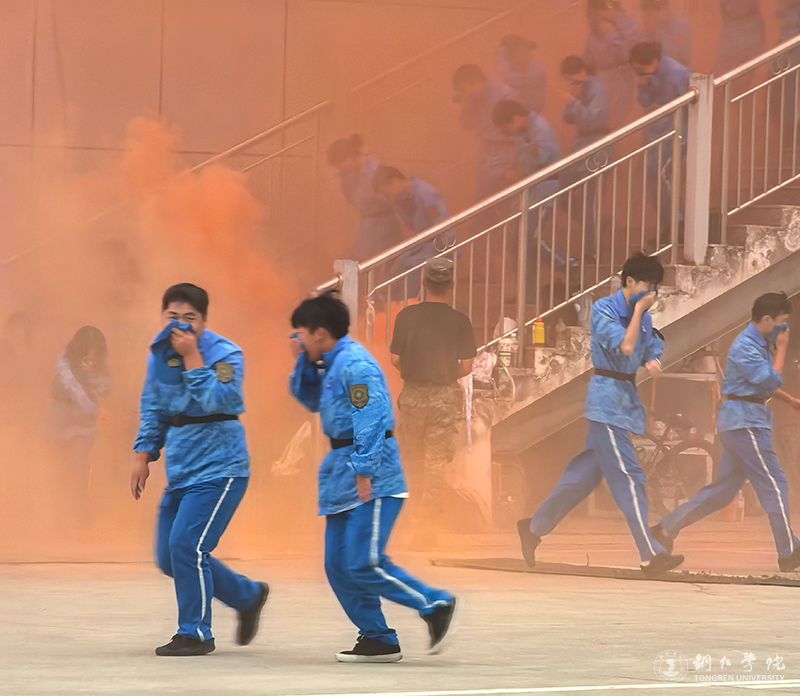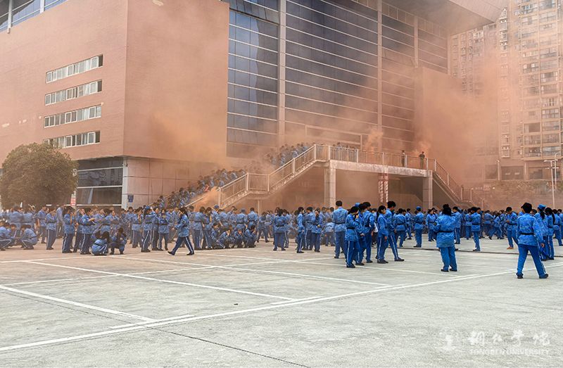 活动以模拟火情疏散演练拉开序幕。随着警报声响起,新生们在教官与保卫处工作人员的指引下,迅速反应,用湿毛巾捂住口鼻、弯腰低姿贴近墙面,沿着预设疏散路线快速向操场安全区域撤离。整个过程紧张有序,无拥挤、滞留情况,初步检验了应急疏散能力。