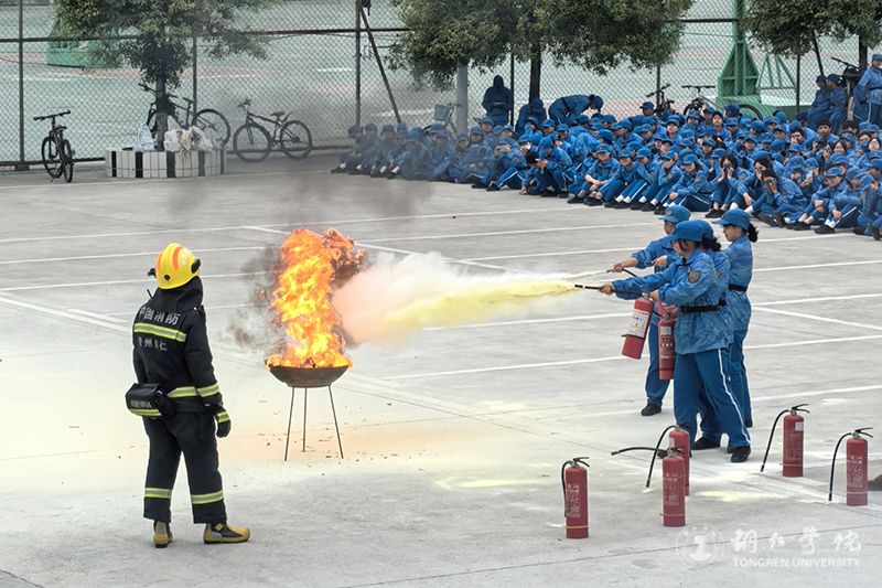 在实操环节,消防员现场演示了干粉灭火器的“提、拔、握、压”使用步骤,并邀请新生代表上前实操。从拿起灭火器到对准火焰根部喷射,新生们在消防员指导下完成灭火操作,亲身体验消防安全的实操要点,切实掌握了基础灭火技能。