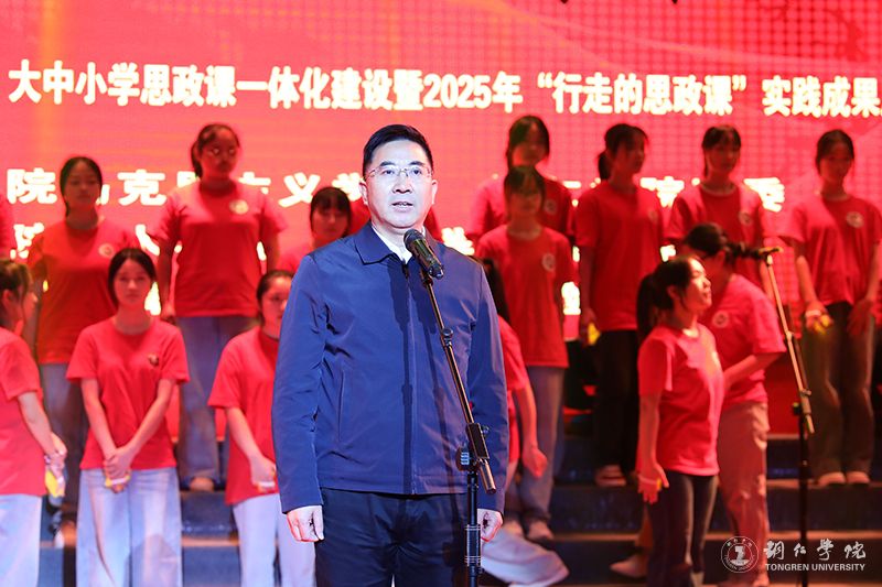 在庄严而热烈的氛围中,朱克乾宣布实践成果展演开幕。马克思主义学院党委书记张江林在致辞中表示,本次活动是深入贯彻落实习近平总书记关于思政课建设重要指示精神的具体行动,也是推进“大思政课”建设从理论走向实践、从课堂融入社会的重要举措。近年来,马克思主义学院与校团委积极探索思政课程与课程思政协同创新,推动“思政+美育”深度融合,旨在通过生动鲜活的艺术形式,让思想政治教育真正“活”起来、“实”起来。