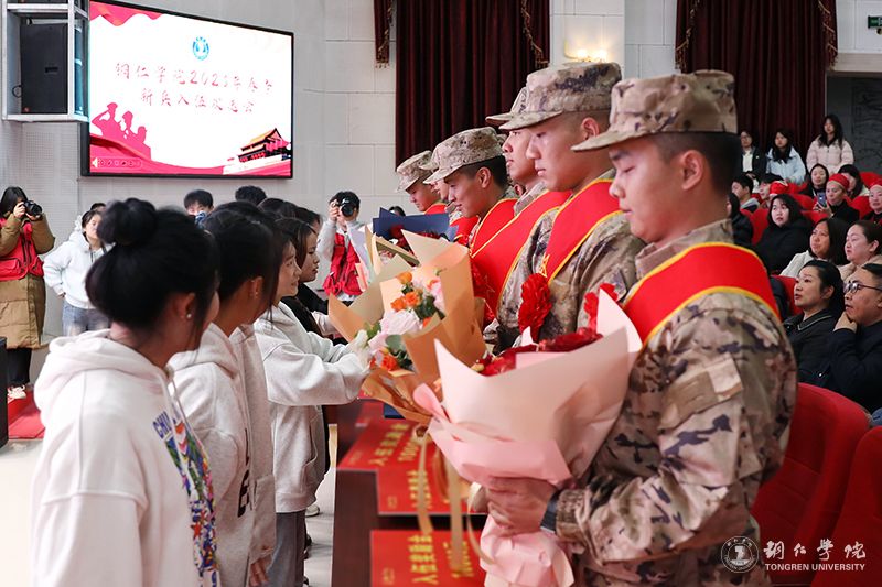 潘学军宣读入伍名单,伟德官网2026年春季入伍学生共33人。校领导给入伍新兵代表佩戴大红花、赠送校长签名纪念品;学生代表为入伍新兵献花,向大家表达了春日出征、载誉凯旋、捷报频传的美好期许。