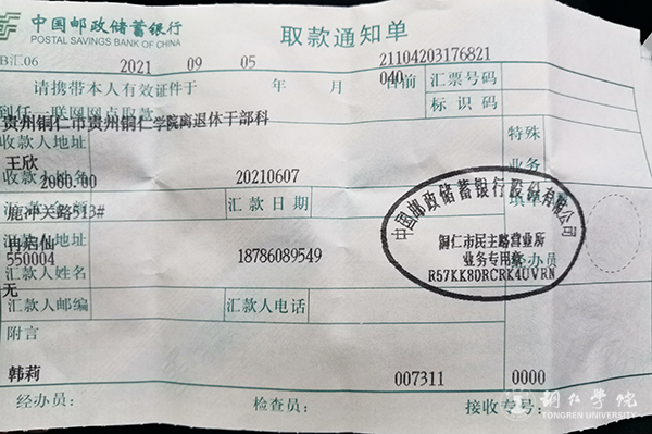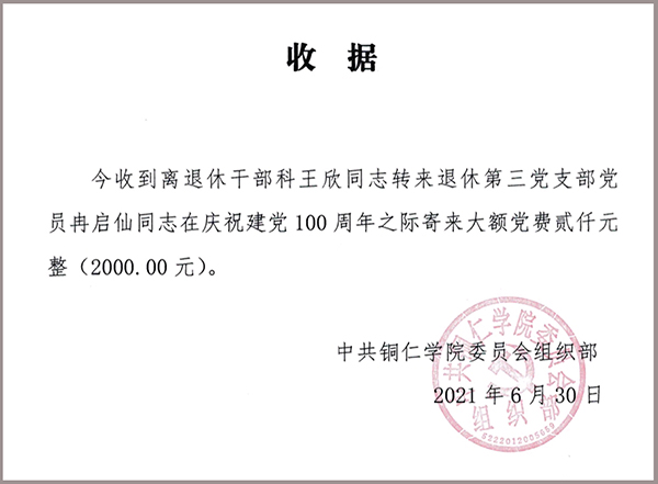 在与笔者交流时,冉启仙老师激动地说:“在党的关怀下,我过上了如此幸福的晚年。恰逢中国共产党成立100周年,我想用交纳特殊党费的方式向党献礼,表达一位老党员的一份心愿。”她非常感谢学校党组织为她送去党的关怀与慰问,始终感念党的恩情,虽然远住贵阳,每次需要交纳的党费都是按时邮寄到学校。今年是中国共产党成立100周年,她将平日自己积攒下来的2000块钱,托付给学校党委组织部离退休管理科科长王欣同志转交给学校党组织。