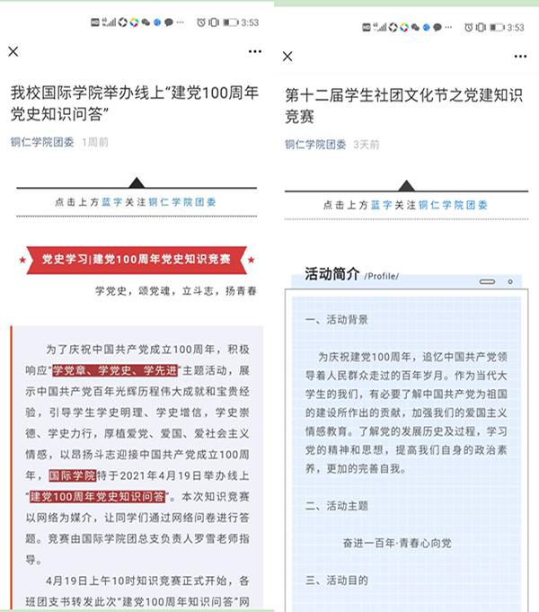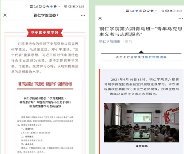 一是以“创作式”拓宽党史学习教育“广度”。为使青年大学生积极参与党史学习教育,营造良好的党史学习教育氛围,团委利用“线下创作、线上推送”相结合的形式,强化青年大学生党史学习教育的主体感及参与感。在“bv伟德国际1946团委”官方微信公众号及校内团属微信公众号开设了“铜院青年学党史·百年党史天天学”“党史百年天天读”“学史力行”“写给党的三行情诗”“党史微课云接力”等专栏,推送了专栏学习资料100余期,得到了广大青年学生的积极参与。在抖音短视频平台发布党史学习教育、党史学习教育校园随机街访相关视频4个,累计观看量近7万次。