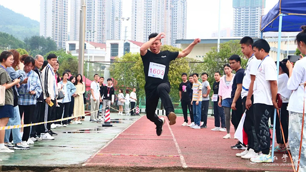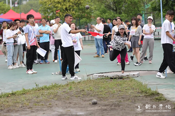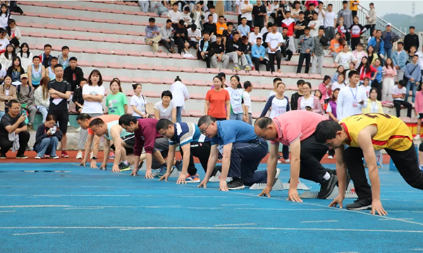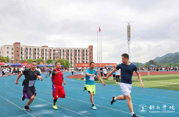 在此次运动会上,教职工竞赛以年龄段分为A、B、C三组,共有5个项目:100米、4*100米、女组200米和男组400米、铅球、跳远。运动会上,教职工们兴趣盎然,认真进行热身等赛前准备。在进行短跑比赛项目时,教师们一个个整装待发,当枪声响起的那一刻,风一般的速度掠过蓝色跑到;场下各个学院的学生为自己院的老师呐喊助威,运动会十分热闹。在进行4*100米项目时,比赛异常激烈,参赛队员一个个精神抖擞,他们的团结友好、恰到好处的默契赢得了比赛更赢得了全场的欢呼。在大家的共同瞩目下,教师们依次进行了跳远和铅球项目。每一个比赛项目,不仅锻炼了大家动手和动脑的能力,还锻炼大家在工作中能够团结协作的精神,这是智慧和体力的角逐,也是团结协作的比拼。