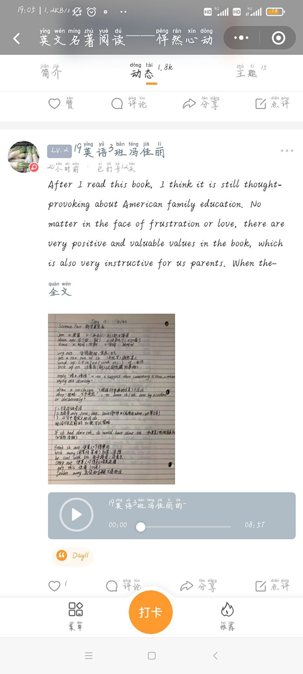 在此之前,国际学院还结合专业特色,通过微信小程序开展了“优秀英文名著阅读打卡”活动。活动过程中,同学们每日坚持阅读,根据讲义做了笔记,并用英语在小打卡上分享了自己的学习感悟。大家纷纷表示,从一开始不太熟练地做笔记,到后面开始记录文章中优美的句子,这个过程,不仅能扩大了英语词汇量、提高英语语言表达能力,还感受到了不同的文化魅力。