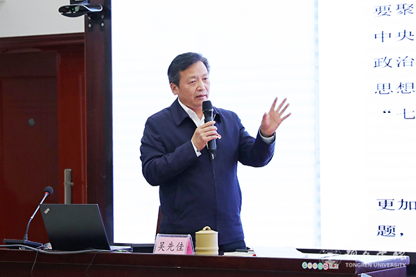 3月18日下午,纪委书记吴先佳以《学习习近平总书记重要讲话精神 高质量监督推进全面从严治党工作》为题,在行政楼8501会议室为伟德官网2021年处级干部学习贯彻习近平总书记视察贵州重要讲话精神、党的十九届五中全会、省委十二届八次全会和市委二届十次全会精神专题培训班授课。全校副处级以上领导干部参加培训。