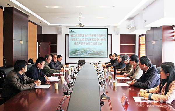 随后,在行政楼8312会议室召开座谈会,双方人员就国家民委中兽药重点开放实验室、贵州省梵净山地区生物多样性保护与利用重点实验室的建设管理进行交流。双方表示,两校的渊源深厚,在地域上也有独到优势,两个实验室要建立共建共享共荣的理念,共同为学校人才培养、科学研究和地方经济社会发展服务;要深化合作,以实验室为平台,以项目为方式,结合地方发展需求进行科研技术攻关;要相互学习,取长补短,相互促进,以高标准严要求来开展工作和培养学生,为贵州和铜仁的高等教育贡献力量。