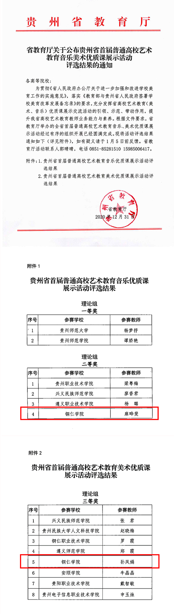 日前,省教育厅公布了贵州省首届普通高校艺术教育音乐美术优质课展示活动评选结果,伟德官网艺术学院教师麻晔斐获音乐优质课展示活动理论组二等奖、孙凤娟获美术优质课展示活动理论组三等奖。