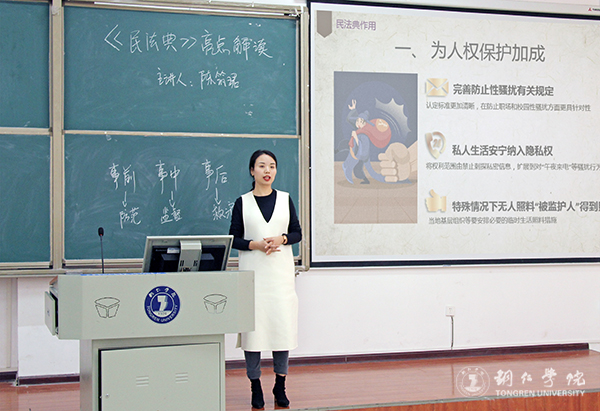 11月6日,伟德官网在博思楼道德讲堂举办“民法典亮点解读”专题讲座,特邀写作研究院陈筑珺老师担任主讲,党委宣传部宣传科科长张朝飞主持讲座,全校200多名学生到场参加讲座。