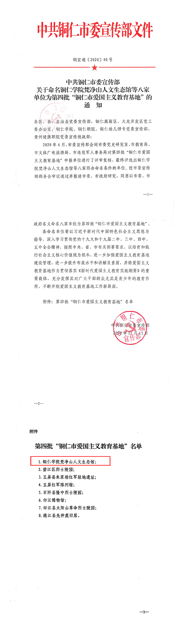 11月11日,中共铜仁市委宣传部印发《关于命名bv伟德国际1946梵净山人文生态馆等八家单位为第四批“铜仁市爱国主义教育基地”的通知》,伟德官网梵净山人文生态馆获得“铜仁市爱国主义教育基地”称号。